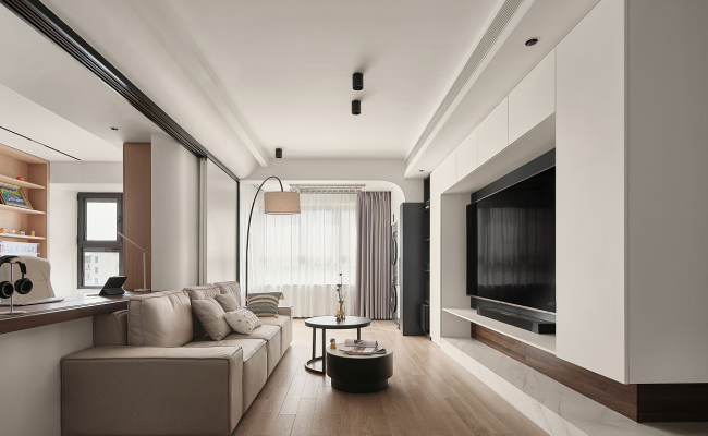 1. 無界通透的功能聯動 以玻璃隔斷、開放式柜體弱化空間邊界,讓客餐廚、書房等區域既獨立又互通——比如客餐廳的半透玻璃墻既保障隱私,又讓光線與視線自然流動,適配日常社交與獨處的雙重需求。 2. 溫柔質感的松弛氛圍 淺原木紋理+人字拼地板傳遞自然溫度,搭配無主燈的漫射光(暗藏燈帶+點光源),讓空間在簡潔中自帶“軟乎乎”的松弛感;局部木色柜體與白色墻面的比例控制,避免單調又不顯厚重。 3. 隱形收納的實用美學 全屋采用“嵌入式+定制柜”的收納系統:玄關柜、臥室衣柜、書房置物架均與墻面一體化,既保持視覺整潔,又通過開放格、隱藏抽屜滿足不同物品的收納需求,讓“整潔”成為空間的原生狀態。 4. 全齡適配的細節溫度 空間預留了靈活場景:主臥的簡約調性適配成年人的靜謐,兒童房的圓弧邊角、趣味置物則兼顧安全與童趣;書房的長桌+移動柜體,可切換為辦公、閱讀甚至臨時社交區,讓家隨生活節奏生長。 這套設計的核心,是用“減法美學”剝離冗余,讓空間回歸“舒適居住”的本質——無需刻意裝飾,每一處細節都在傳遞“卸下疲憊,自在生活”的松弛感。