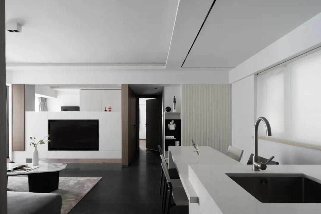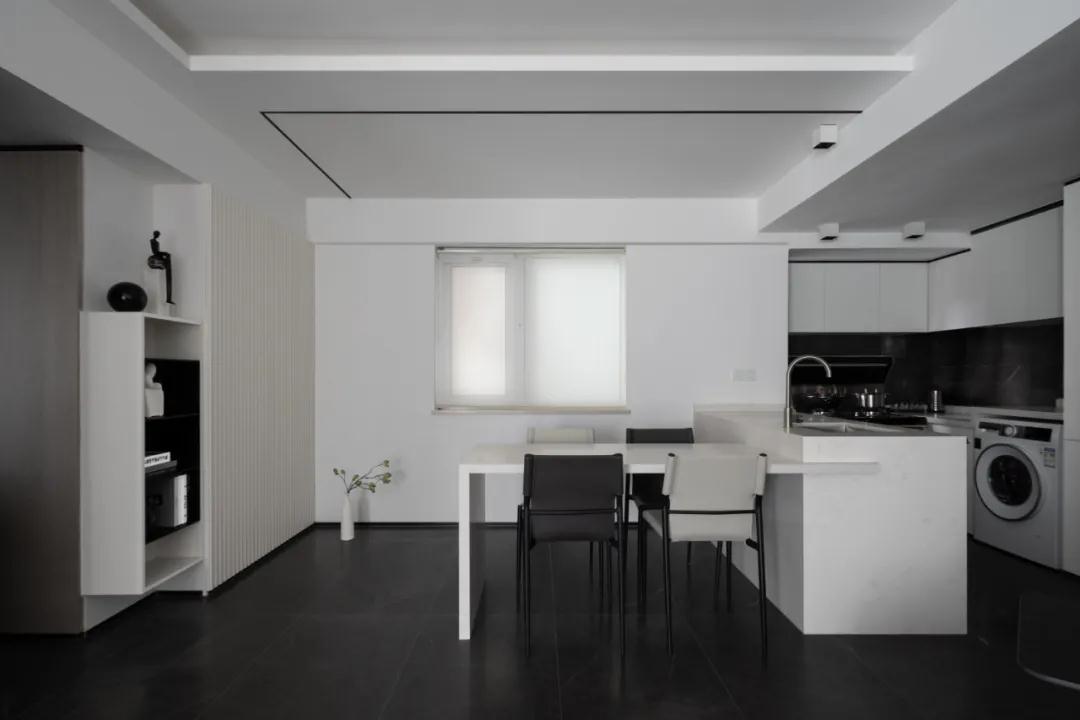 在承載了重要生活場景的餐廚區(qū)域,設(shè)計師直接把玻璃門和墻體打掉之后,開放式廚房搭配島臺設(shè)計,將整個餐廚空間融為一體,顯得通透、明亮。通過輕松簡約的造型與黑白灰的色調(diào)來呈現(xiàn)空間里的都市感。