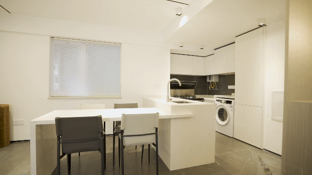 直接從操作臺延展出餐桌,形成連貫化設(shè)計,充分節(jié)省空間。餐廚空間也有了更加直接的互動,閑來下廚聚會,女主人與親朋好友擁有了更多的交流空間,在島臺上沖沖咖啡、在餐桌邊品品小酒,悠然自得。
