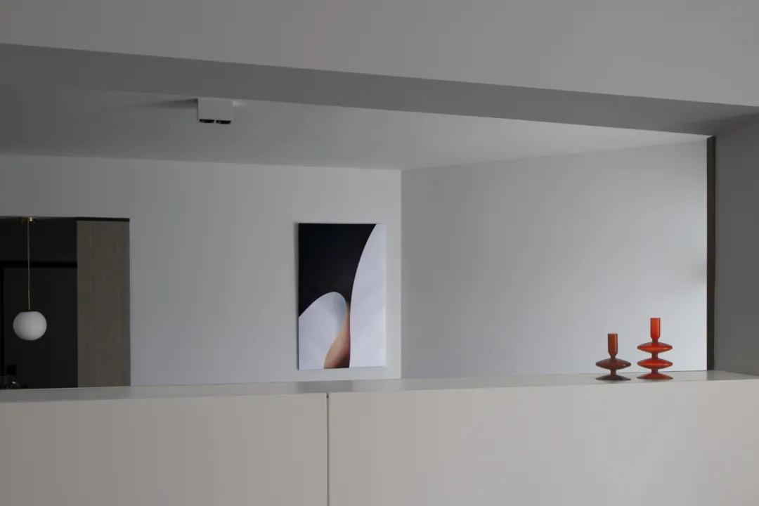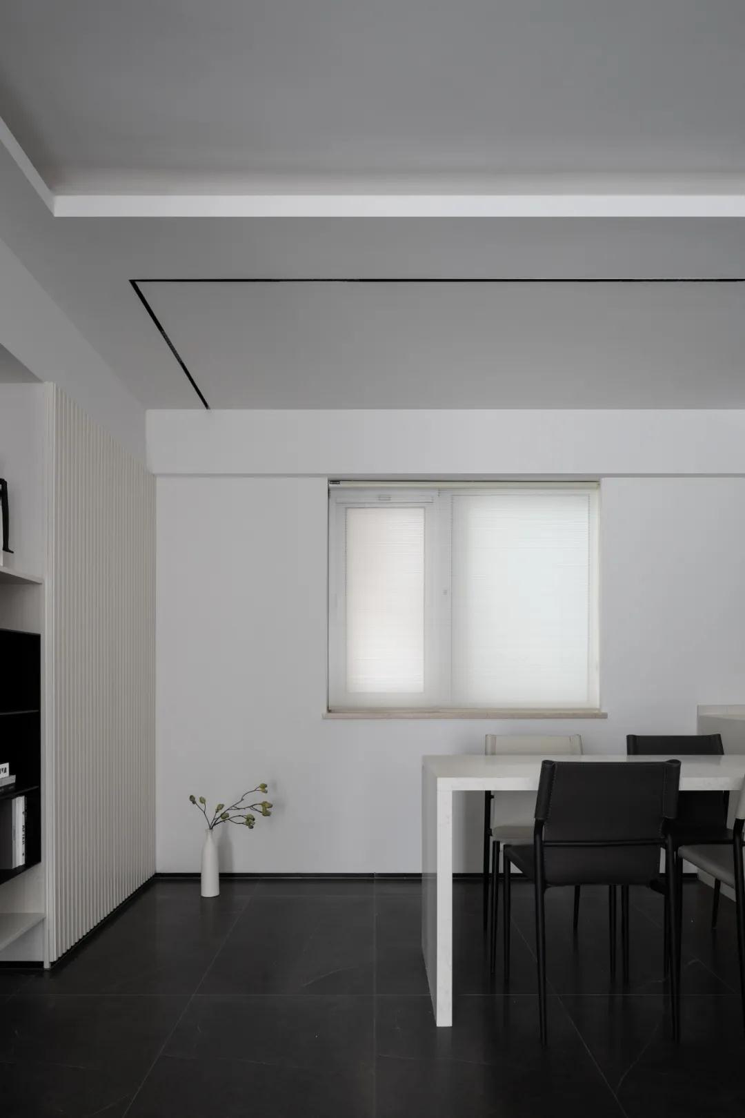 由于房子層高還不到2.6米,客廳與書房之間的墻面留出長條形窗口作為連通,從書房看出去,交錯視線,讓整個空間有深遠(yuǎn)不盡的感覺,虛實之間趣味倍增。