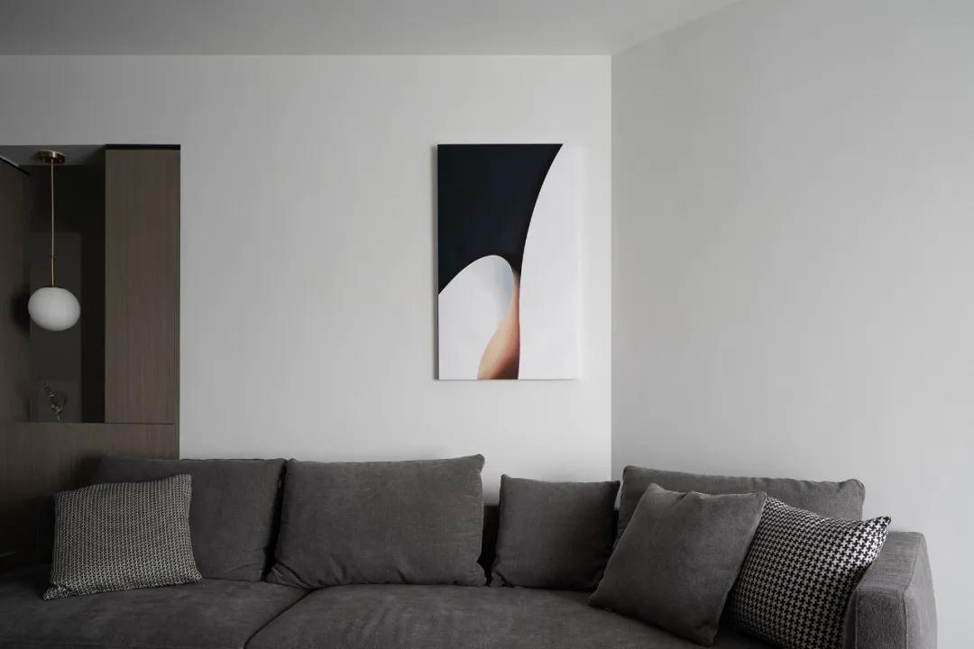 設(shè)計師選擇拐角沙發(fā)弱化了客廳異型結(jié)構(gòu),完美解決鉆石角所造成的尖銳感,變?nèi)毕轂榱咙c(diǎn)。墻上的抽象畫為整個空間增添了藝術(shù)的氣息,給原本稍顯寡淡色調(diào)加了精彩的一筆。