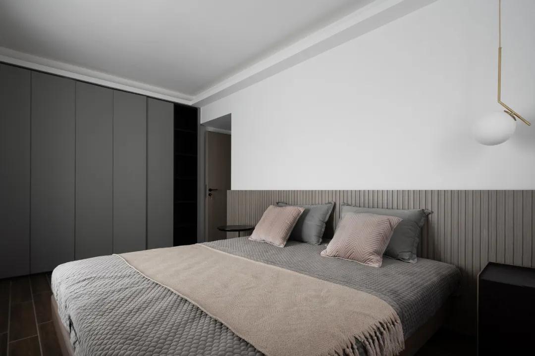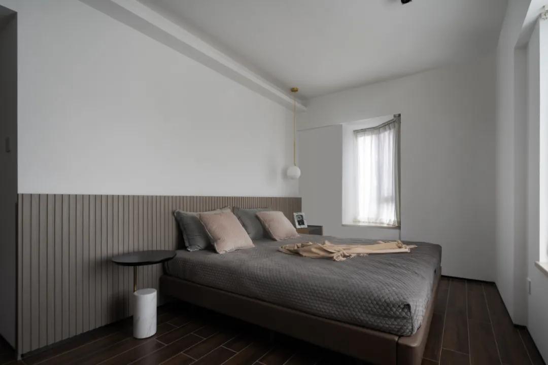 主臥就設(shè)計比較簡單了,床靠后以半墻條紋型的護(hù)墻板做裝飾,在簡潔的空間中點(diǎn)綴以適當(dāng)?shù)募±砑?xì)節(jié),濃淡相宜。