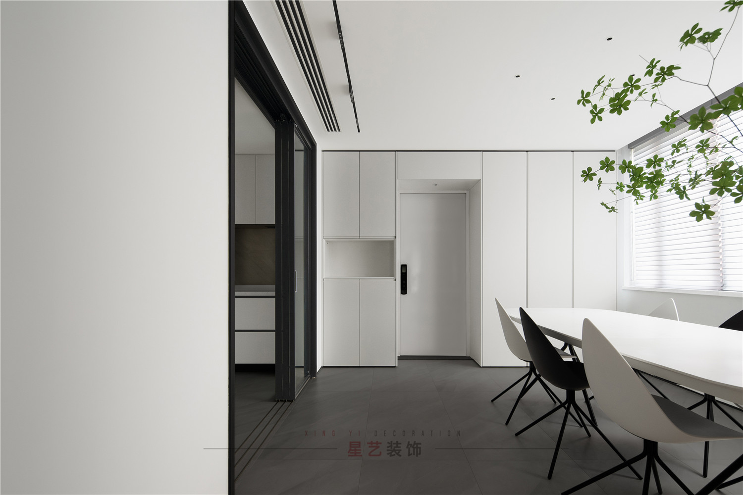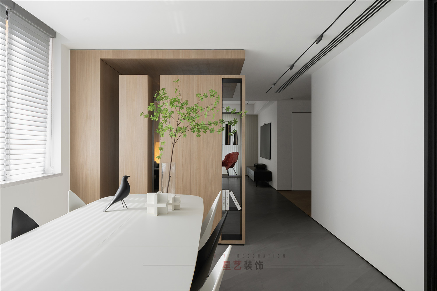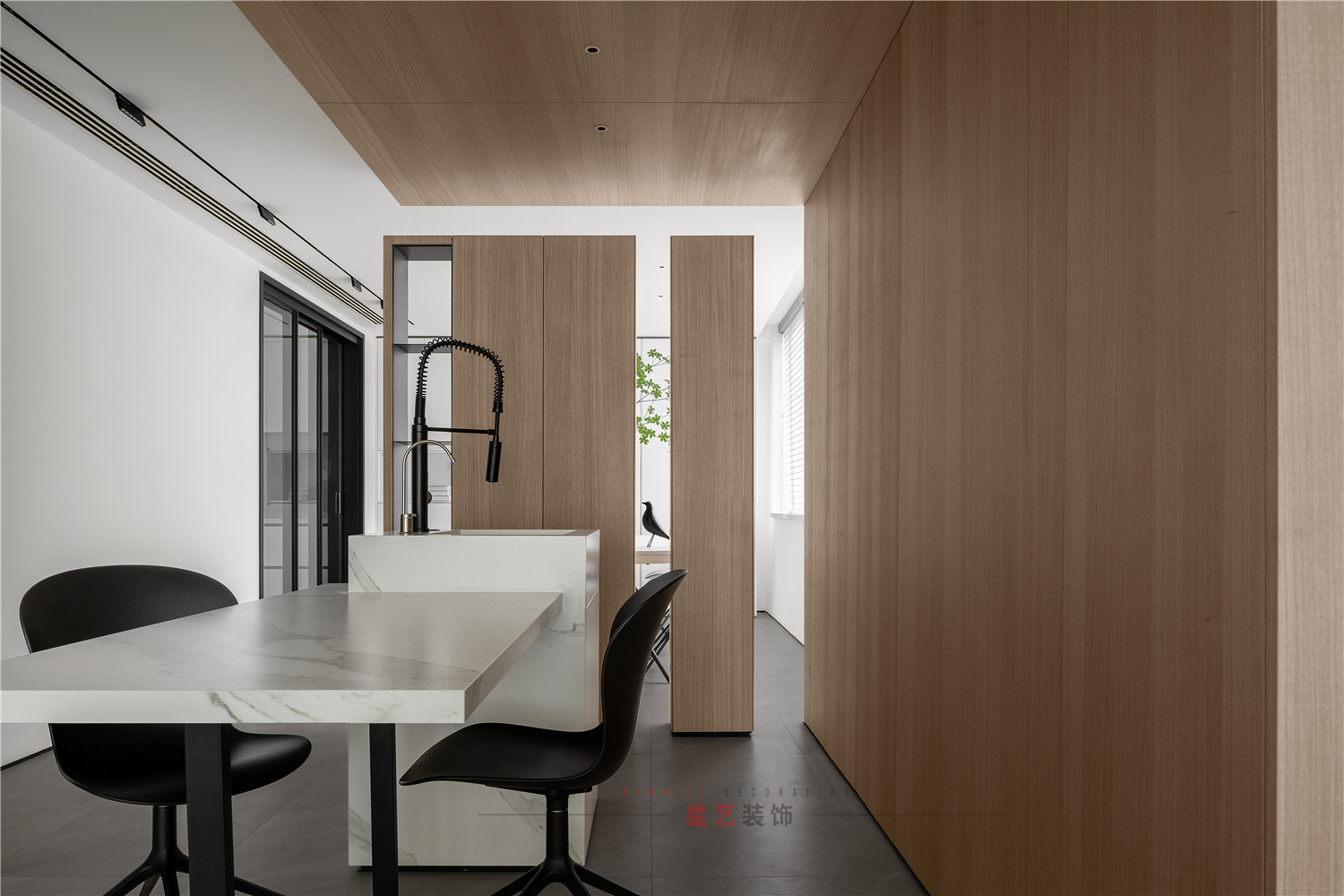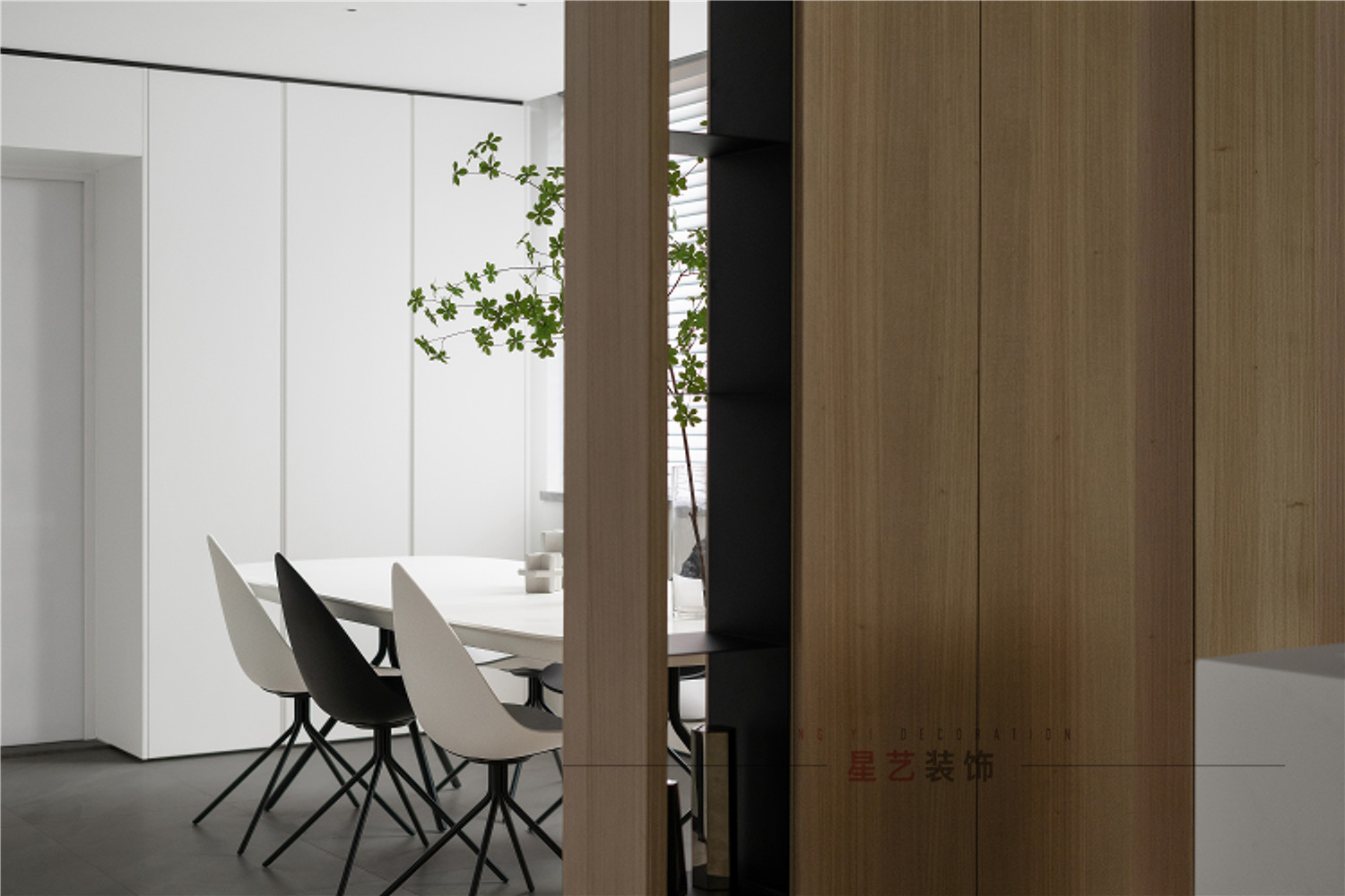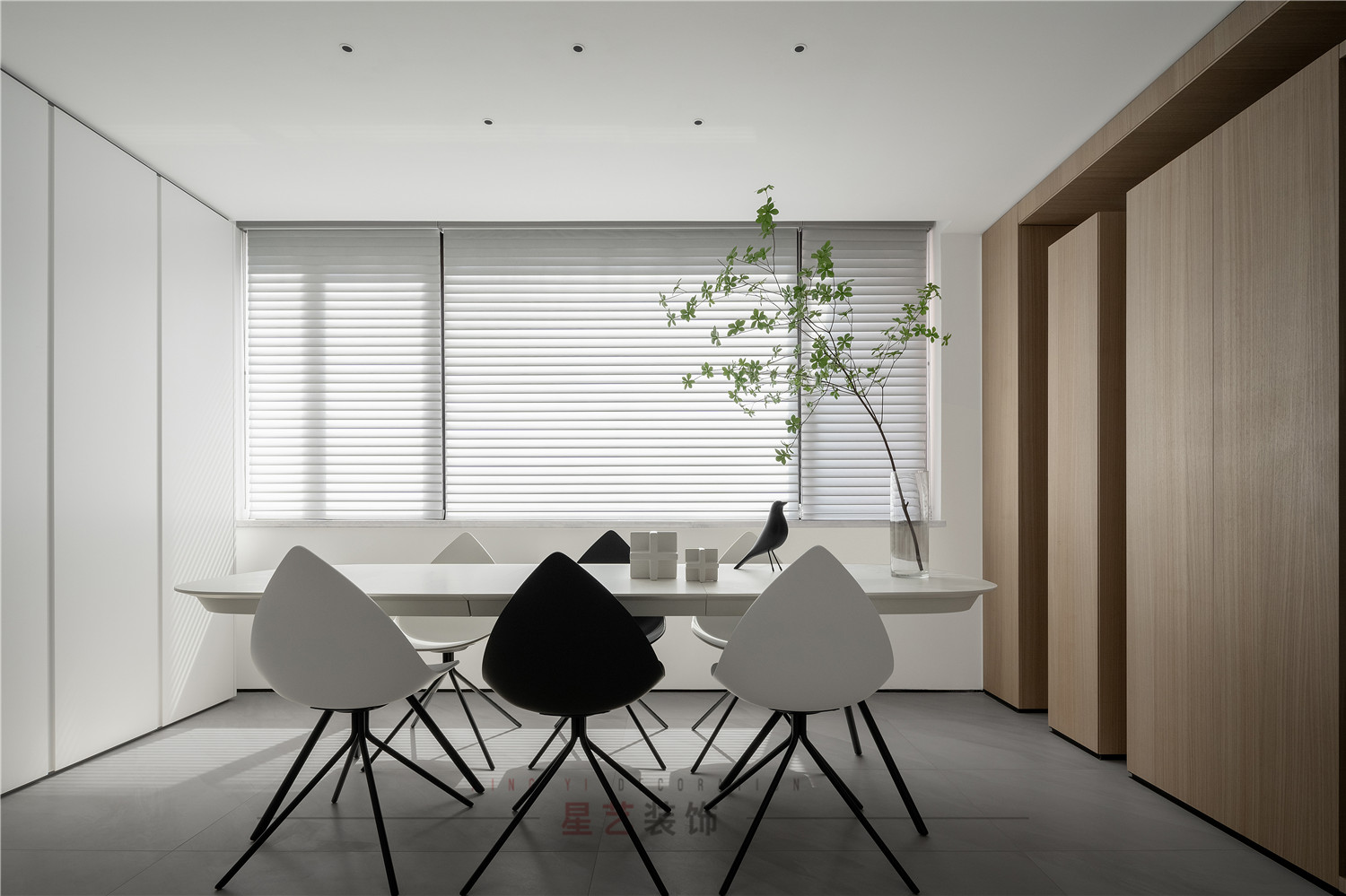 餐廳部分清新明亮,大面積的百葉窗與白色儲(chǔ)物柜在視覺(jué)上延伸用餐區(qū)的空間,黑白相間的桌椅虛實(shí)結(jié)合,讓整個(gè)空間有了沉穩(wěn)的底色,像是化雪后清晨,迸發(fā)勃勃生機(jī)。