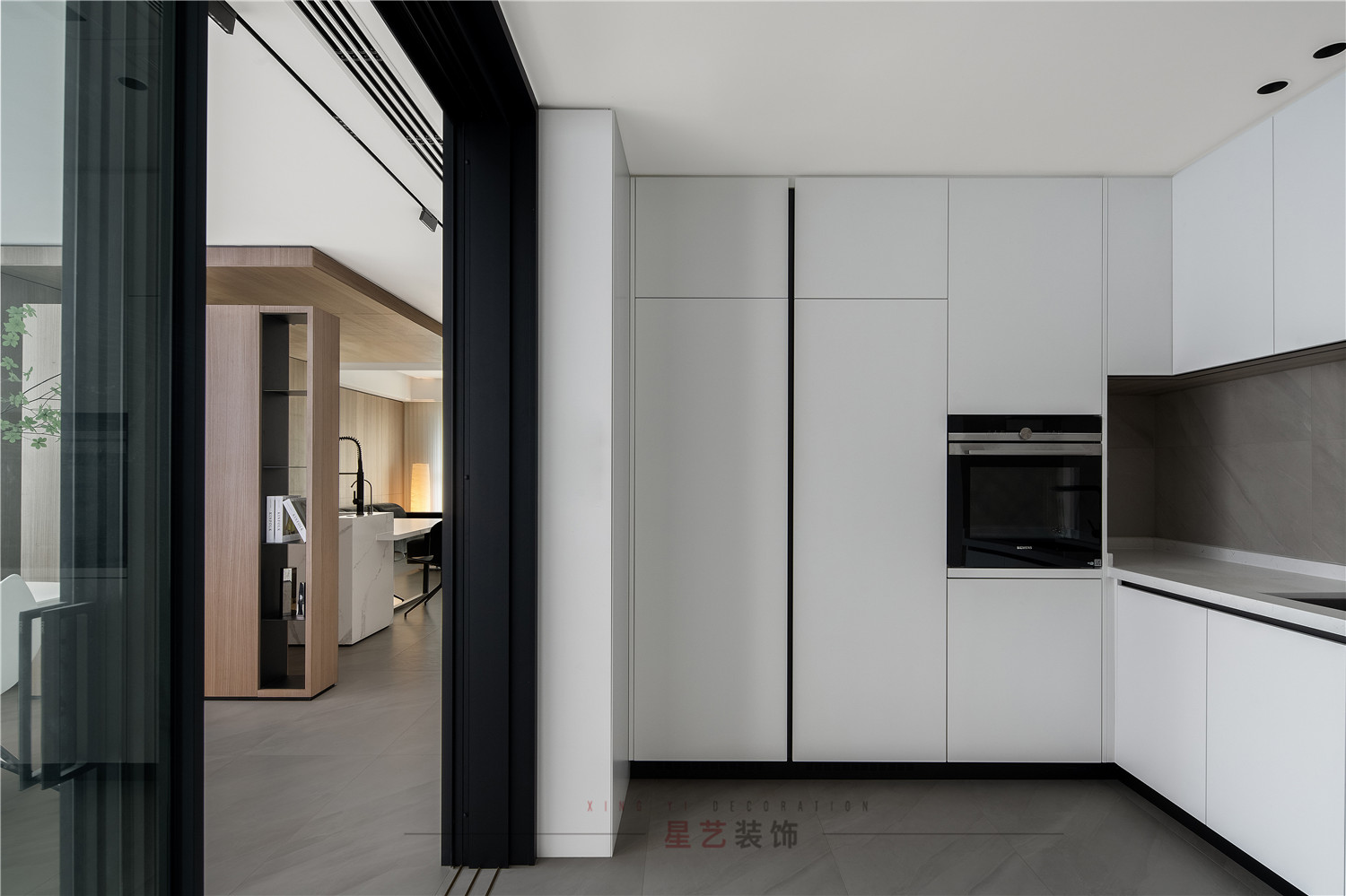 值得一提的是,整個(gè)設(shè)計(jì)都采用了大量的隱形門(mén)設(shè)計(jì),利用空間的錯(cuò)落造成視覺(jué)上落差,既不會(huì)顯得突兀也豐富了整體的空間層次。