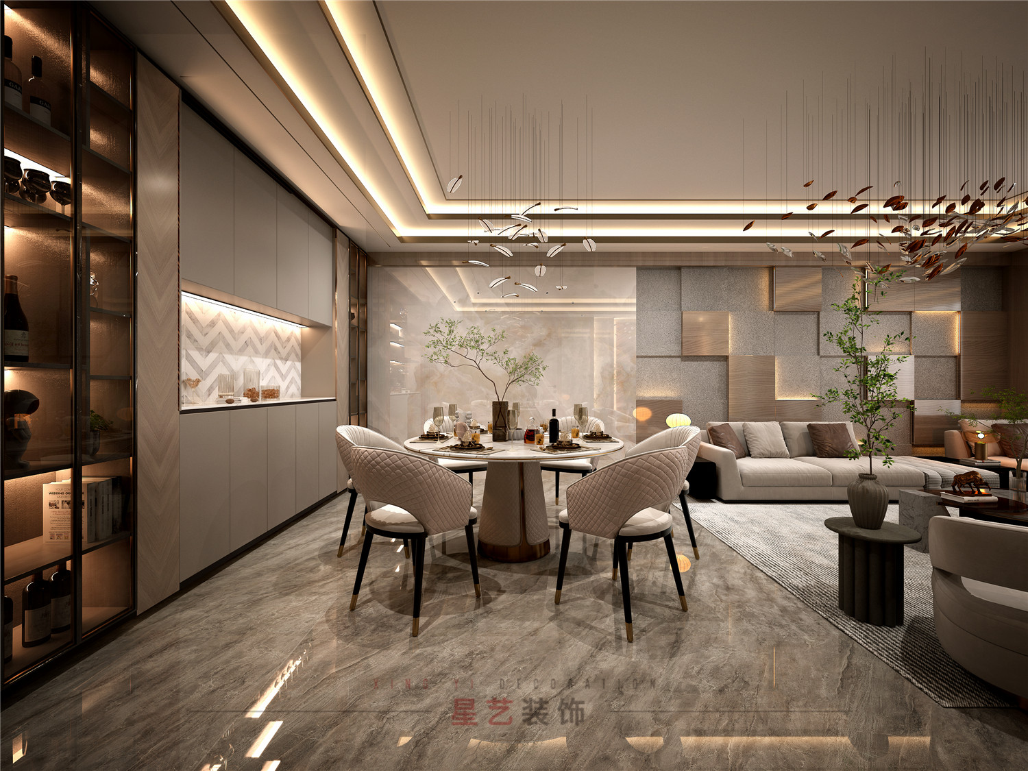 客餐廳以開放式呈現(xiàn),用不同形式的暖色燈光增添溫馨華麗的氛圍,不規(guī)則的客廳背景展現(xiàn)裝飾主義帶來的視覺沖擊。餐廳側(cè)面做了一邊酒柜,品味一種極致,未入喉,已醇香四溢。