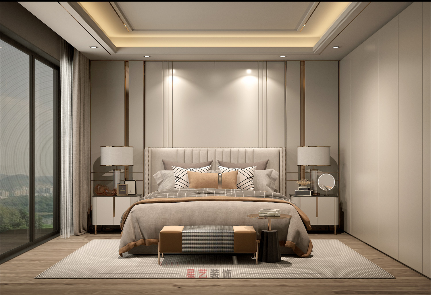主人房與長輩房風(fēng)格比較相似,對稱式的空間分割方式表現(xiàn)出細膩的質(zhì)感層次,布局上疏密有度,簡繁相適。
