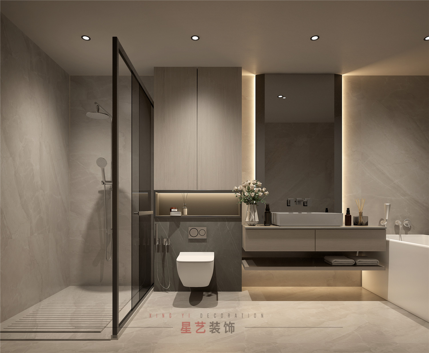 極簡線條的浴室柜更加流暢自然,筒燈與燈帶設(shè)計相結(jié)合,燈光效果別具一格。壁掛馬桶,顏值在線而且無衛(wèi)生死角,磨砂感瓷磚,壁掛浴室柜,每一件物品都是精挑細選,搭配起來氣質(zhì)和諧。