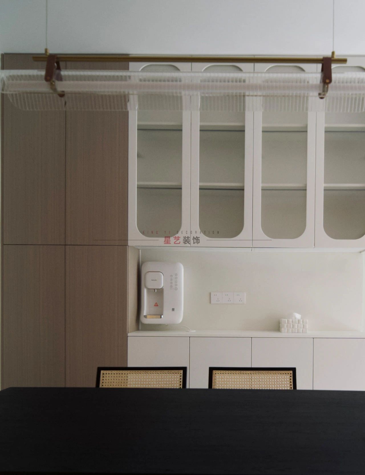餐桌旁幾乎一整面墻的儲(chǔ)物柜,純白色弱化了存在感,中間留了開放格,可以放小型的咖啡機(jī)和常用物品。